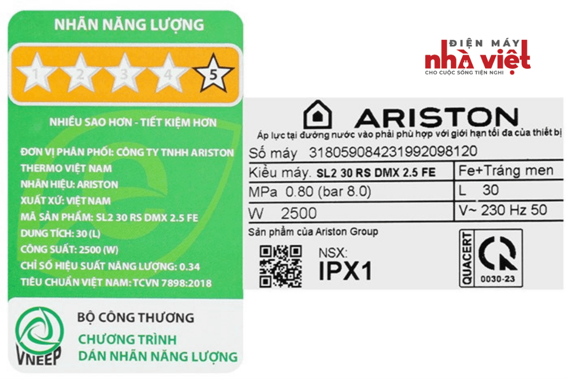 Máy nước nóng gián tiếp Ariston 30 lít 2500W SL2 30 RS DMX 2.5 FE có bình chứa nước tráng men Titan bền bỉ, dung tích 30 lít, tích hợp công nghệ Nano bạc kháng khuẩn giúp cung cấp nguồn nước nóng sạch sẽ, an toàn cho sức khỏe, công nghệ Flexomix giúp tăng thêm đến 10% lượng nước nóng, bảo vệ người dùng với hệ thống an toàn đồng bộ TSS, cầu dao chống rò điện ELCB, van xả áp an toàn,...