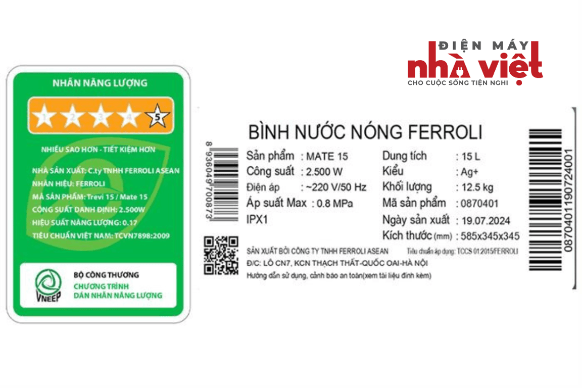 - Thuộc dòng máy nước nóng gián tiếp, Ferroli 15 lít 2500W Mate 15L Ag+ có bình chứa dung tích 15 lít phù hợp với gia đình khoảng 2 thành viên.