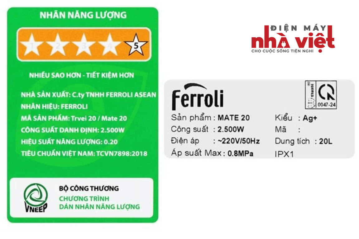 - Thuộc dòng máy nước nóng gián tiếp, Ferroli 20 lít 2500W Mate 20L Ag+ có dung tích 20 lít, phục vụ tốt cho nhu cầu dùng nước nóng của gia đình khoảng 3 thành viên.