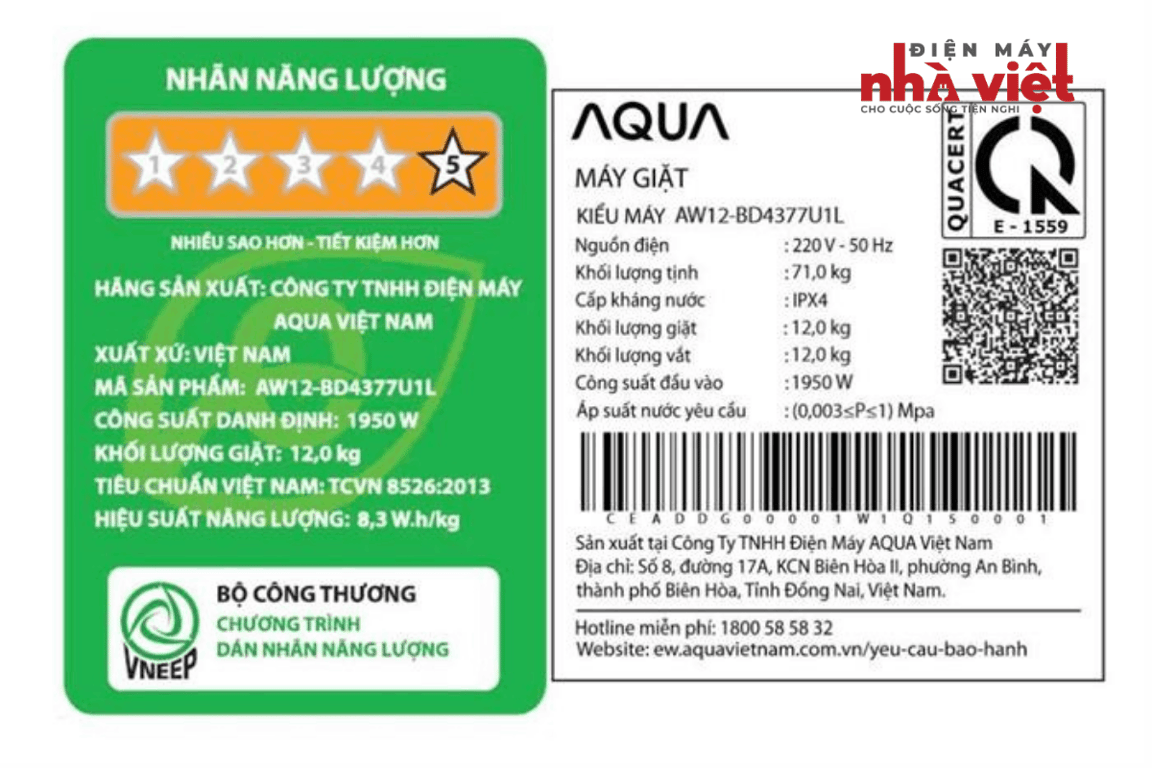 Máy giặt cửa trước có hiệu suất tiêu thụ chỉ 10 Wh/kg, được chứng nhận 5 sao theo tiêu chuẩn EER (TCVN 8526:2013) rất tiết kiệm điện, mang lại hiệu quả kinh tế cao cho người dùng.