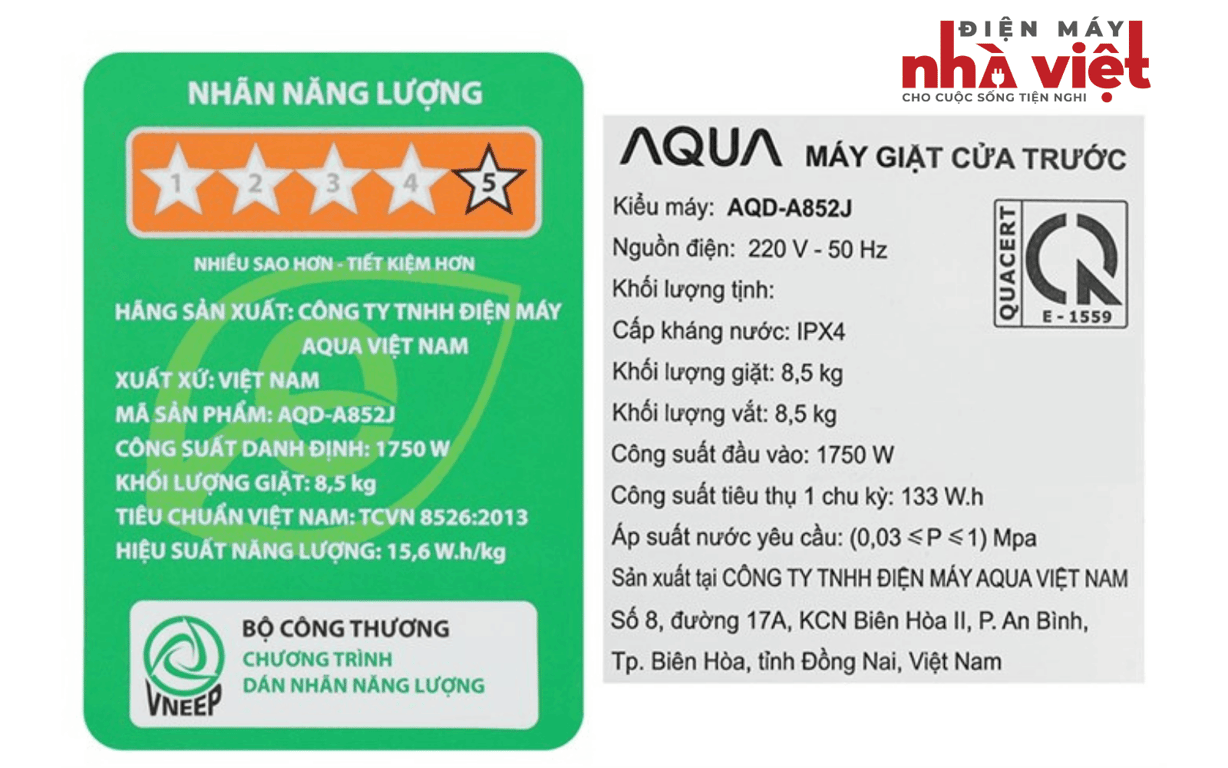 - Nhãn năng lượng chuẩn 5 sao, hiệu suất sử dụng điện là 15.6 Wh/kg.