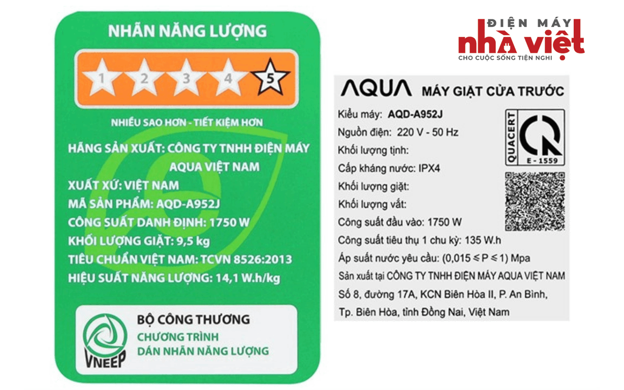 - Nhãn năng lượng chuẩn 5 sao, hiệu suất sử dụng điện là 14.1 Wh/kg.