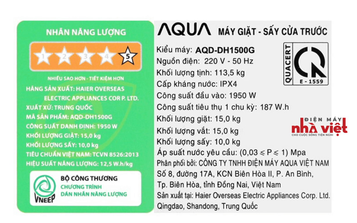 - Có nhãn năng lượng tiêu chuẩn 5 sao, hiệu suất sử dụng điện là 12.5 Wh/kg.