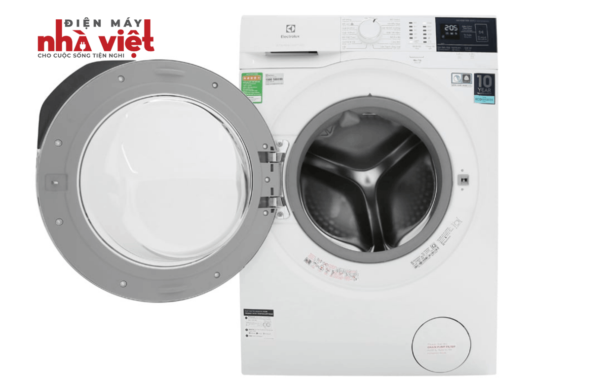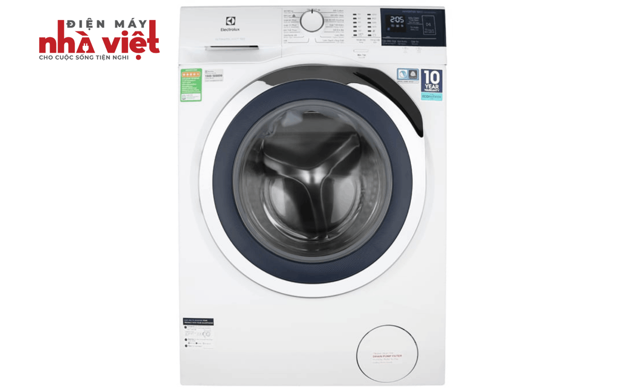 Máy giặt Electrolux EcoInverter 10 kg EWF1024BDWA với sắc trắng trang nhã, cùng vẻ ngoài cứng cáp chắc chắn. Sản phẩm này mang phong cách hiện đại với thiết kế cửa trước, có trang bị thêm bảng điều khiển song ngữ Anh - Việt cho bạn dễ dàng sử dụng hơn.