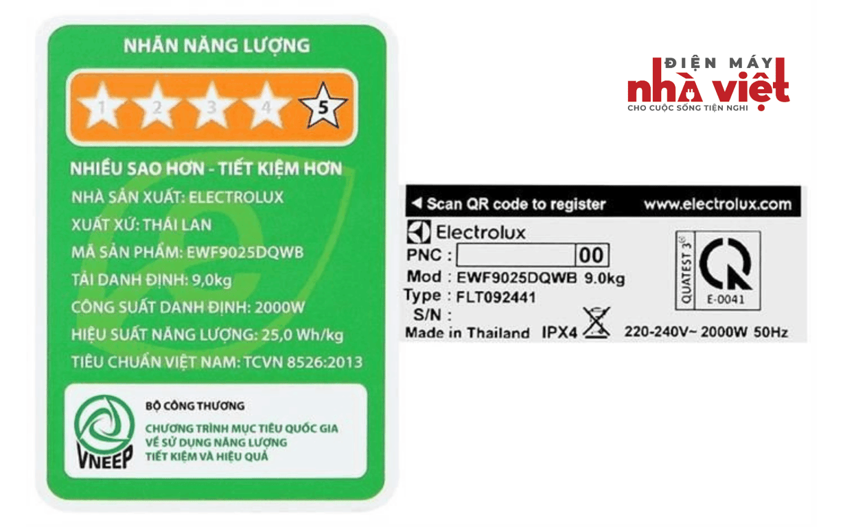 - Sản phẩm đạt nhãn hiệu năng lượng 5 sao với hiệu suất sử dụng điện khoảng 25 Wh/kg.