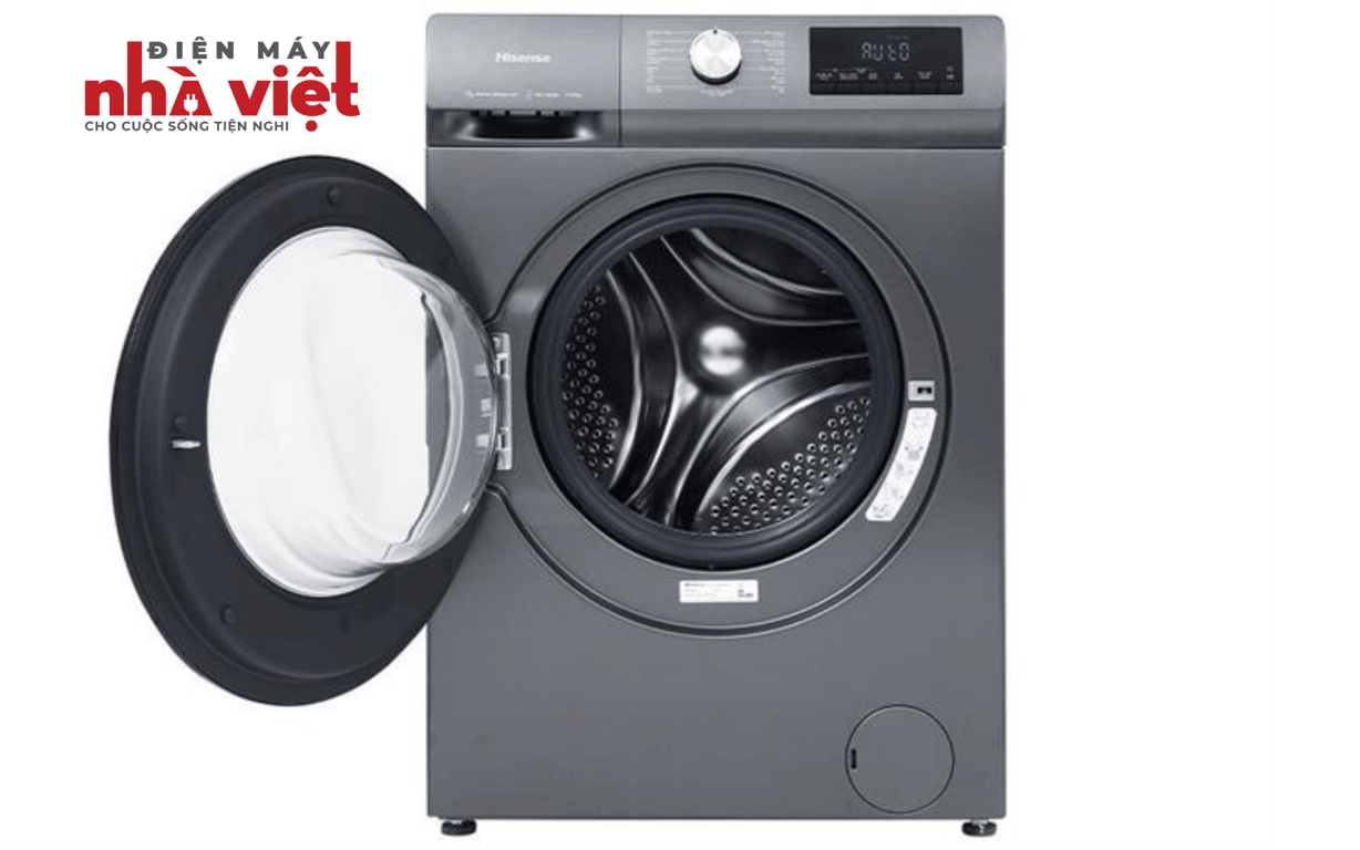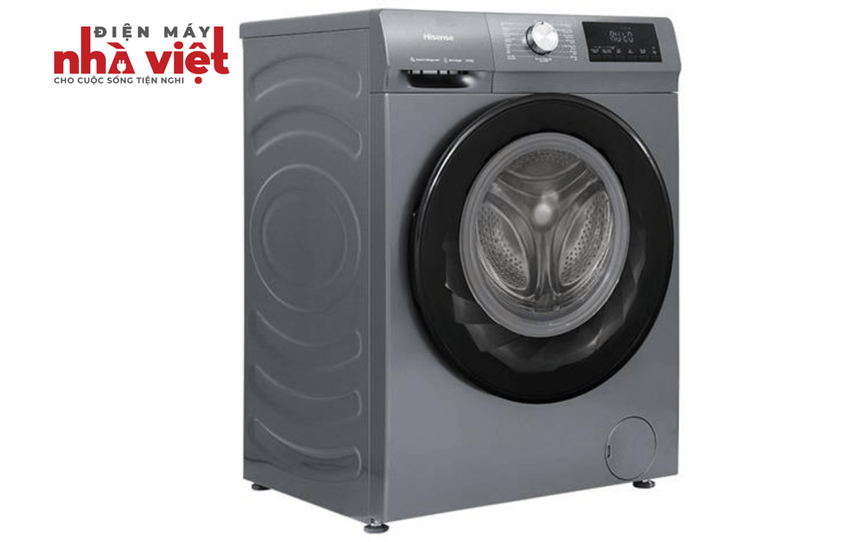 - Máy giặt Hisense có dạng cửa trước - lồng ngang, đi cùng gam màu xám titan sang trọng, hài hòa với nhiều kiểu không gian nội thất.