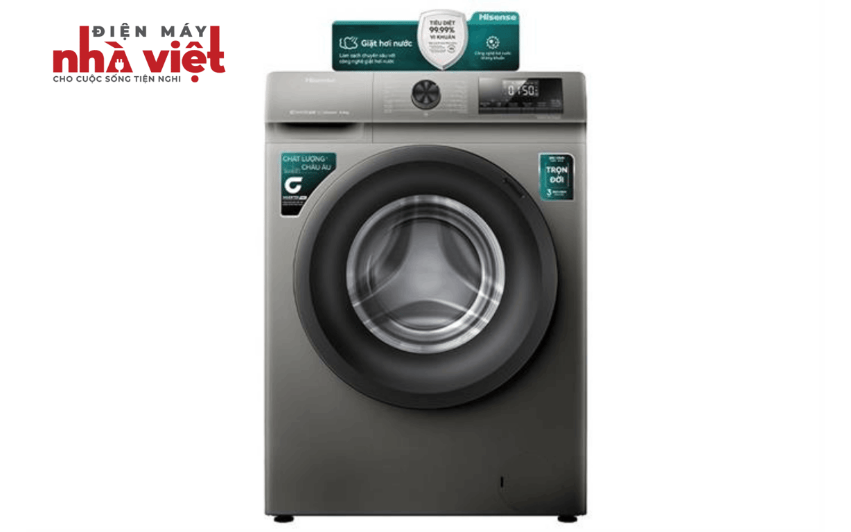- Máy giặt Hisense cửa trước - lồng ngang với màu xám titan, phù hợp với nhiều không gian nội thất trong nhà bạn.