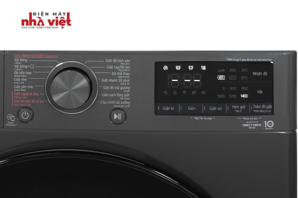 - Trang bị 14 chương trình giặt, đáp ứng tốt cho nhiều nhu cầu giặt giũ khác nhau, giúp giặt sạch và bảo vệ tốt cho chất liệu. Cụ thể là: chu trình tải về, vải bông, vải bông +, giặt đồ hơi nước trẻ em, ngừa dị ứng, giặt nhanh 14 phút, giặt nhẹ, giặt êm, vệ sinh lồng giặt, đồ hỗn hợp, thể thao, tinh xảo, giặt ga giường.