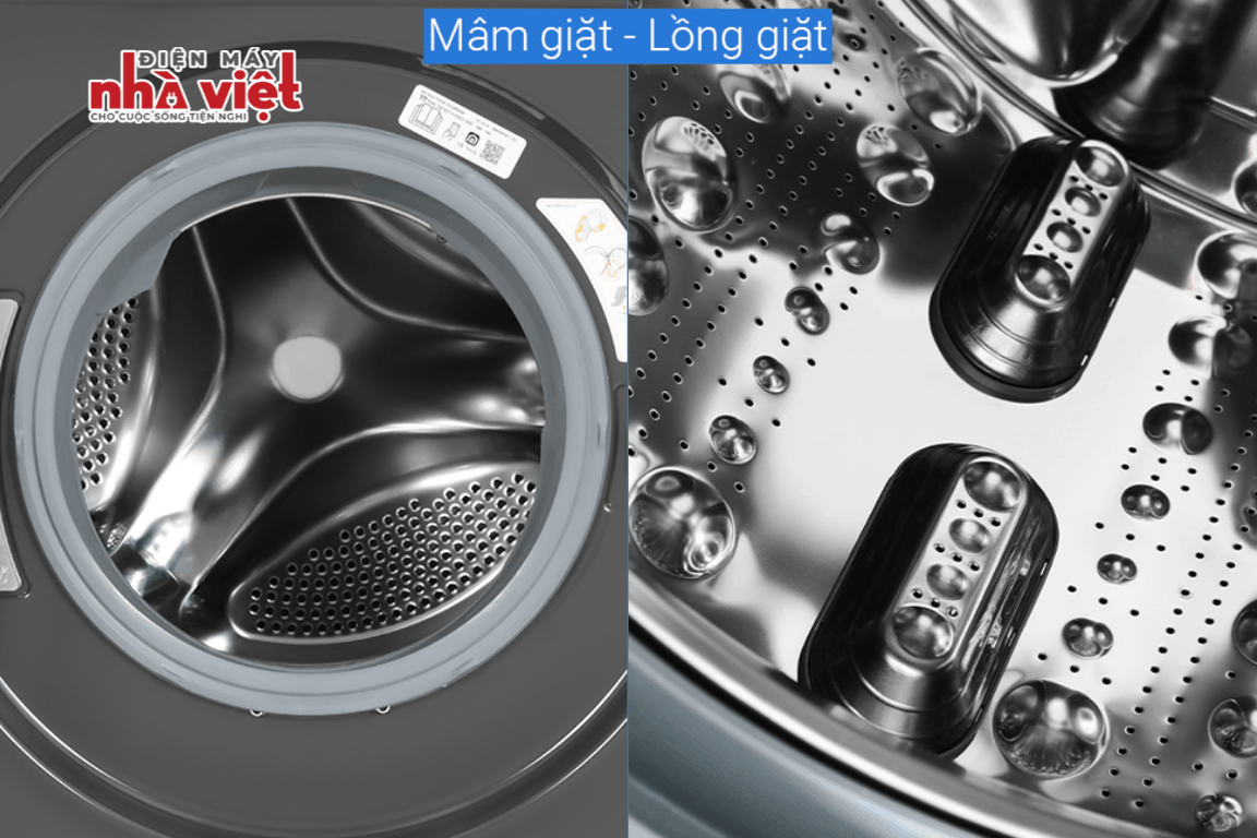 - Lồng giặt được hoàn thiện bằng chất liệu thép không gỉ giúp chống lại vi khuẩn đến 99%, chất liệu này thường được sử dụng trong các loại máy chế biến thực phẩm.