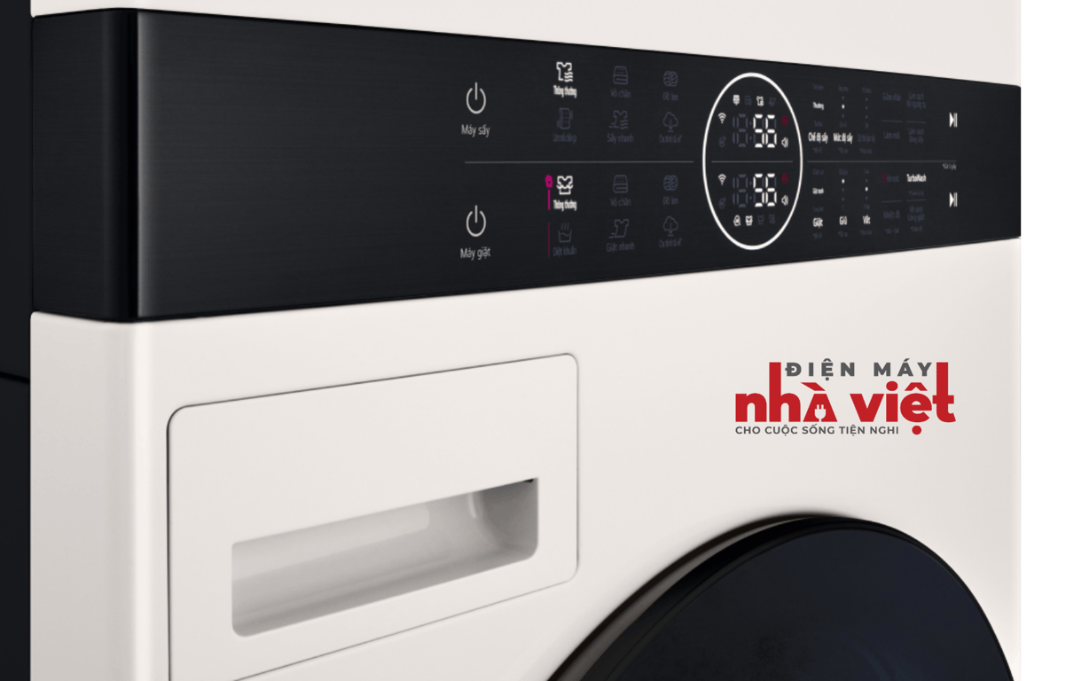 - Bảng điều khiển cảm ứng chỉ dẫn tiếng Việt kết hợp màn hình hiển thị sắc nét, thiết kế trực quan và nằm ngay ở vị trí trung tâm, bố trí cao hơn bảng điều khiển của 2 máy giặt và máy sấy đặt chồng lên nhau đến 85 mm. Nhờ đó người dùng dễ dàng tiếp cận và tùy chỉnh chương trình giặt, sấy linh hoạt.