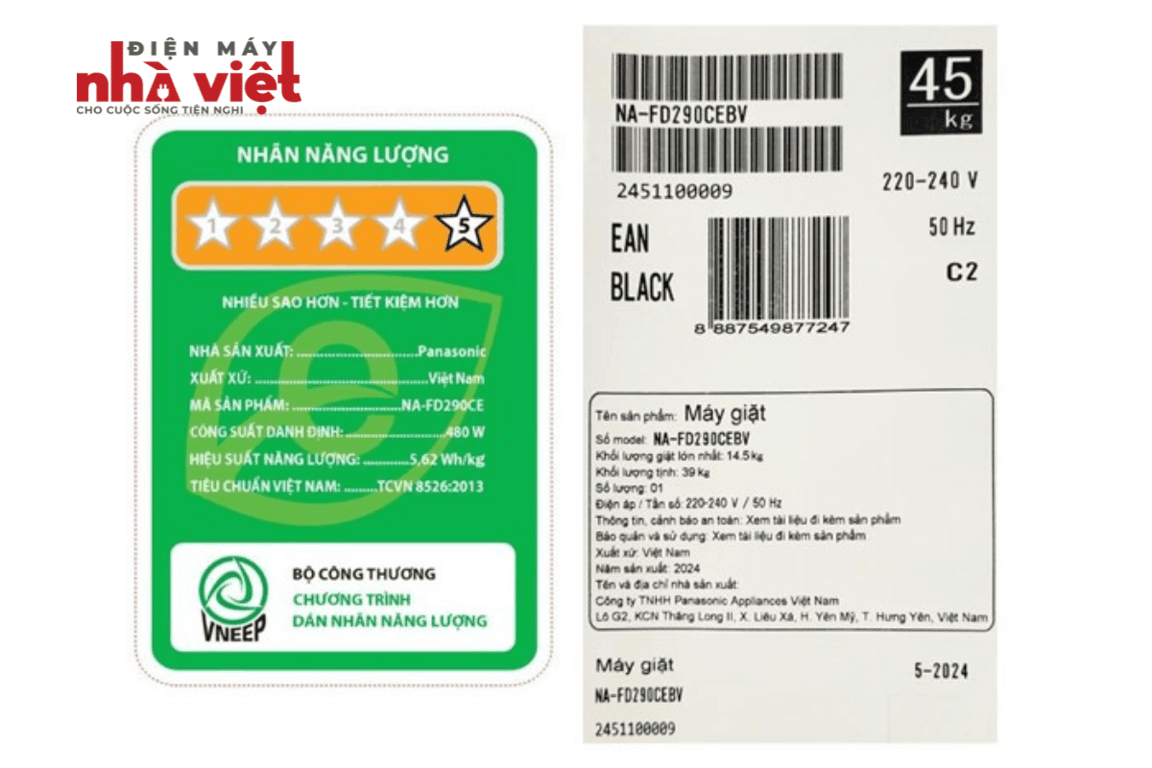 - Nhãn năng lượng chuẩn 5 sao, hiệu suất năng lượng 5.62 Wh/kg.