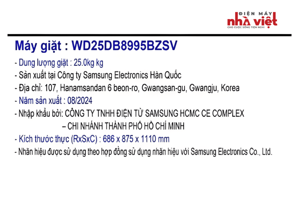 *Dựa trên thử nghiệm nội bộ của Samsung, cần đáp ứng một số điều kiện thử nghiệm nhất định. Kết quả thực tế có thể khác nhau tùy thuộc vào tải trọng giặt.