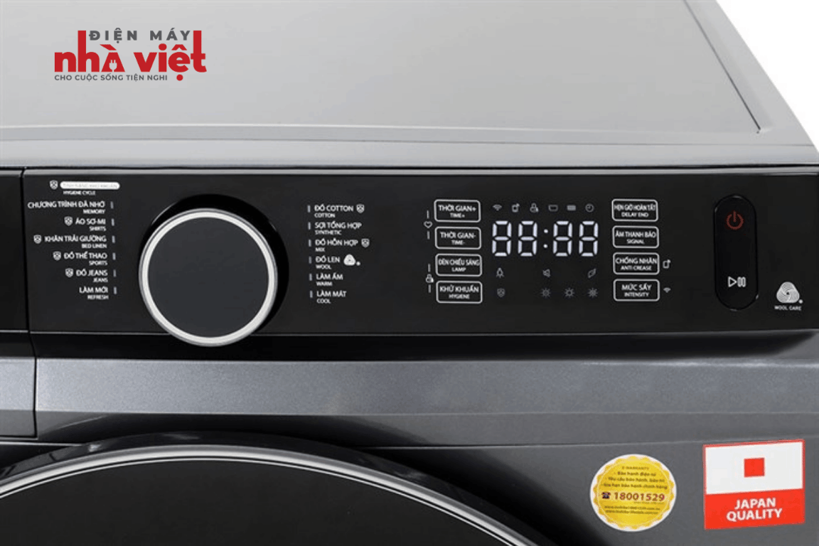 - Bảng điều khiển tiếng song ngữ Anh - Việt, kết hợp giữa núm xoay và cảm ứng cùng màn hình hiển thị tiện lợi, cảm ứng nhạy, thao tác điều khiển máy sấy đơn giản.