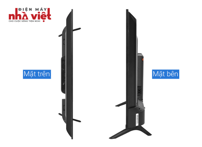 - Chân đế có mặt trước bằng kim loại, thiết kế hình chữ V úp ngược giúp đặt tivi vững vàng trên bề mặt bàn, kệ tủ. Bạn có thể tách rời chân đế và bày trí tivi theo kiểu treo tường cho không gian phòng trông thoáng rộng hơn.