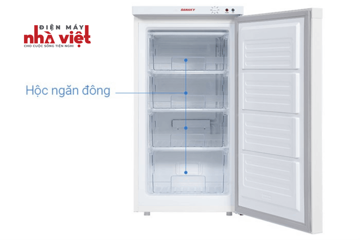 Tủ đông đứng Sanaky có dung tích 118 lít với 4 hộc chứa riêng biệt giúp phân chia thực phẩm dễ dàng và hạn chế lẫn mùi sang các ngăn khác trong tủ.