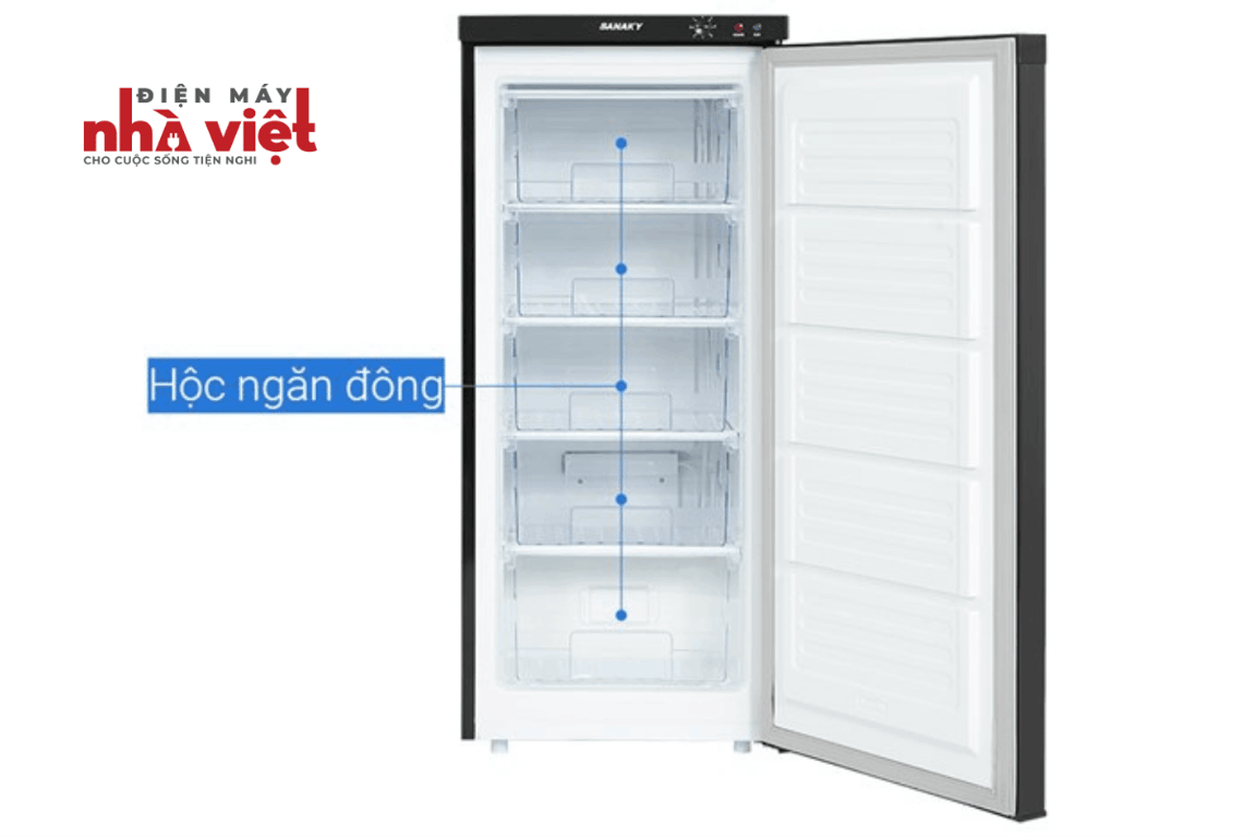 - Tủ đông Sanaky được thiết kế 1 cửa với 5 hộc chứa, nhỏ gọn, mang gam màu đen thanh lịch, nên có thể đặt bất kì đâu trong khu vực phòng bếp, góc nhỏ của phòng khách hoặc trước sảnh để thuận tiện cho việc kinh doanh, buôn bán.