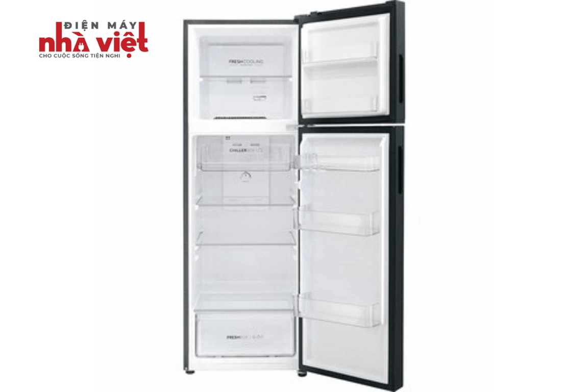 - Chiếc tủ lạnh này có kiểu dáng 2 cánh với ngăn đá trên, lớp vỏ bên ngoài được phủ một màu đen xám khói nhẹ nhàng tăng thêm nét sang trọng và tinh tế trong không gian nội thất.