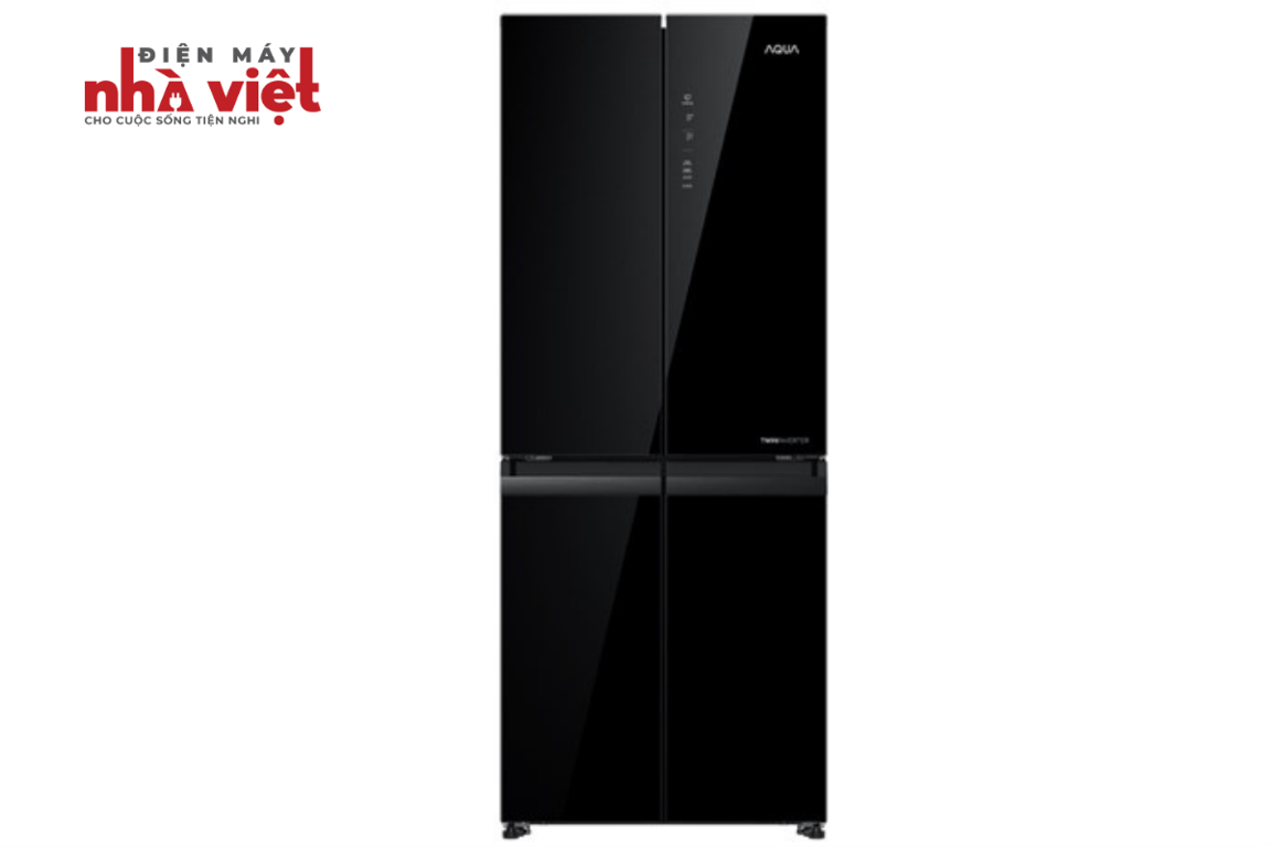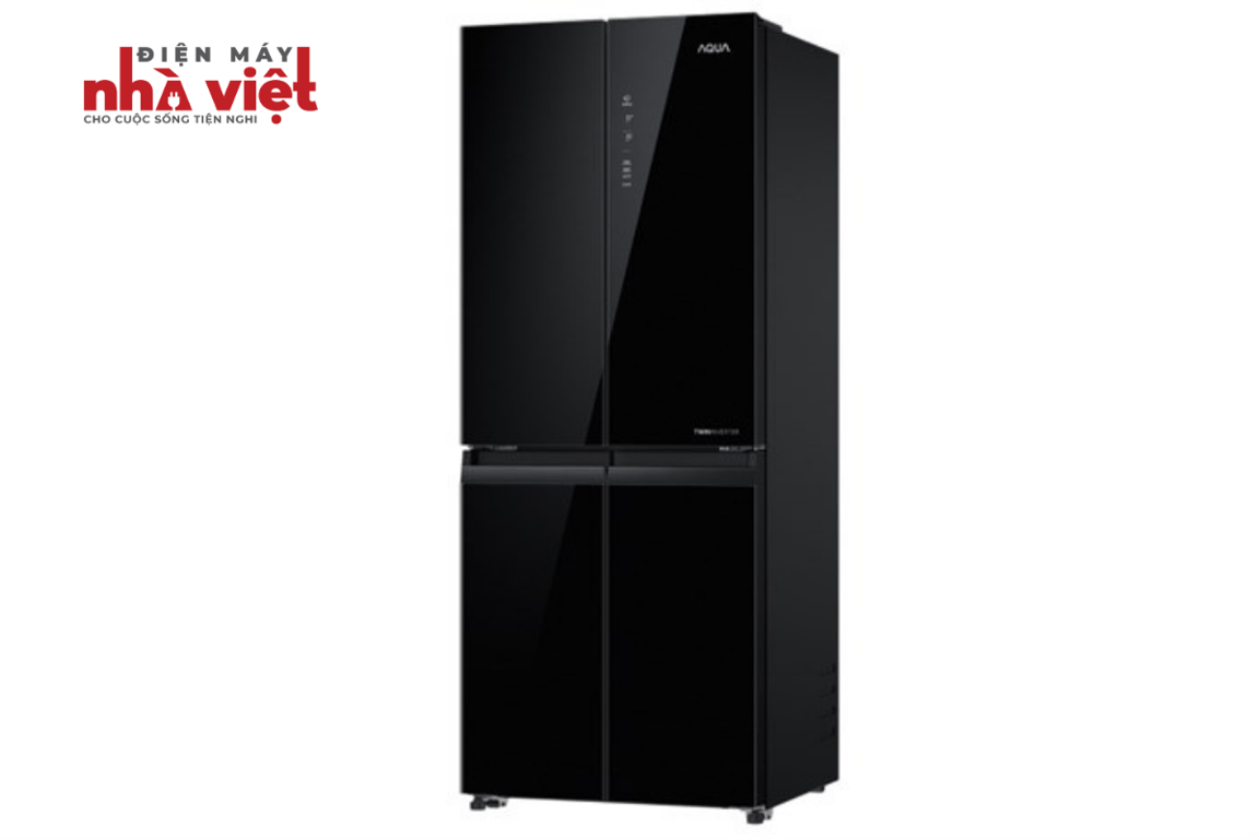 - Cửa tủ lạnh được thiết kế với mặt kính màu đen chủ đạo, mang lại vẻ hiện đại, sang trọng cho không gian bếp. Bề mặt này giúp việc vệ sinh tủ dễ dàng, chống trầy xước và giữ cho tủ lạnh luôn sáng bóng và mới mẻ.