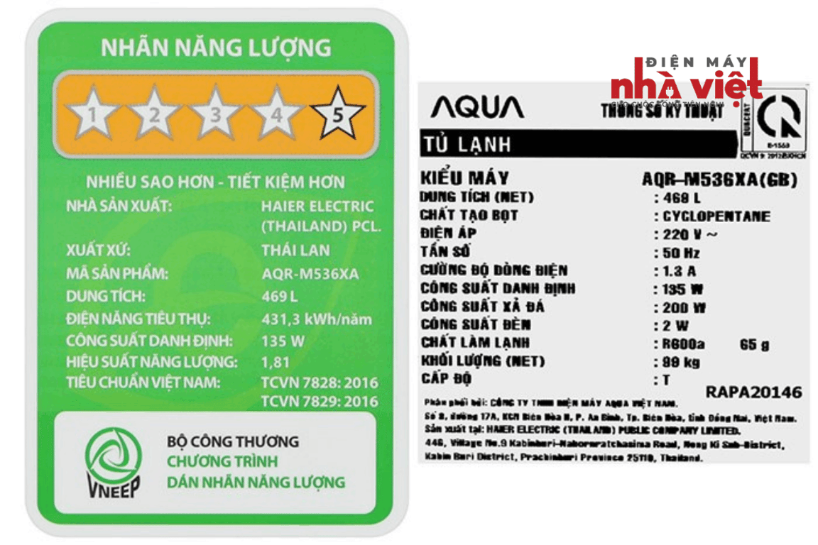 - Tủ lạnh Aqua có nhãn năng lượng 5 sao với hiệu suất sử dụng điện khoảng ~ 1.18 kW/ngày.
