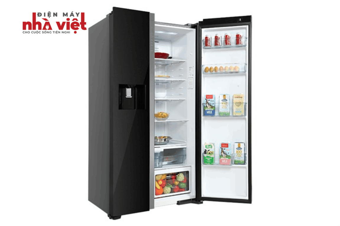 - Thuộc dòng tủ lạnh Side By Side được thiết kế 2 cánh, màu đen sang trọng với chất liệu cửa tủ làm bằng kính không viền tinh tế, phù hợp cho mọi vị trí bên trong nhà bếp.