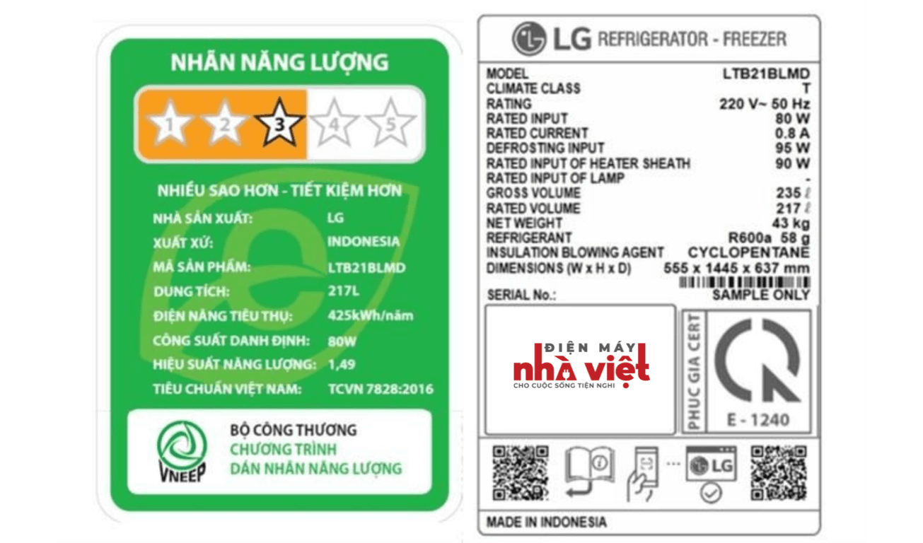 Tủ lạnh hoạt động với công suất tiêu thụ ~425 kWh/năm.