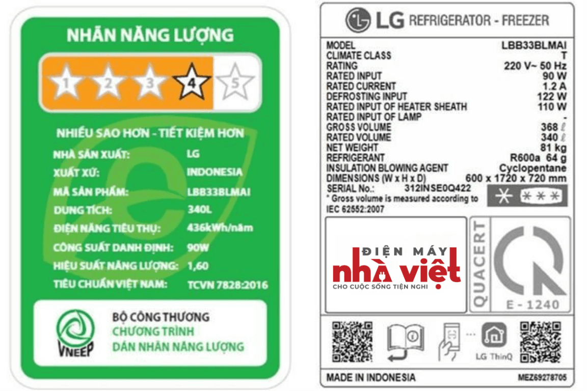 - Tem năng lượng 5 sao. Công suất tiêu thụ công bố theo TCVN ~ 1.057 kW/ngày.