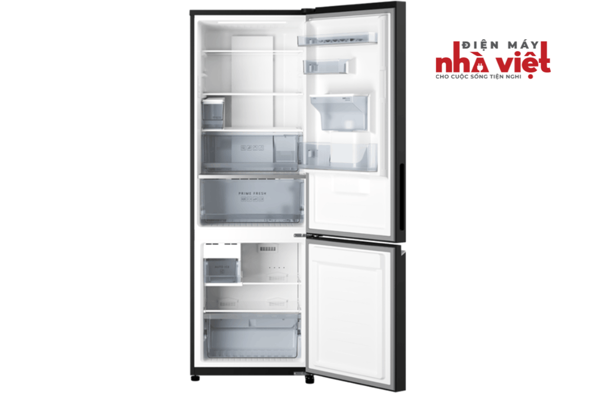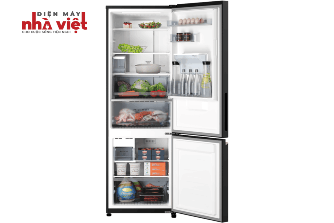 Tủ lạnh nổi bật với thiết kế phẳng tinh tế, cửa tủ kim loại đen sang trọng phù hợp với không gian nội thất hiện đại. Tủ lạnh 2 cửa này có thiết kế ngăn đá phía dưới thay vì ngăn đá trên như các dòng sản phẩm phổ thông cũ. Cách bố trí ngăn mát ở trên sẽ vô cùng tiện lợi bởi ngăn mát là nơi được dùng thường xuyên hơn, người dùng sẽ không cần cúi người khi lấy thực phẩm. Dung tích sử dụng 300 lít, trong đó, ngăn lạnh dung tích 203 lít, ngăn đá 97 lít phù hợp với nhu cầu sử dụng của gia đình 3 - 4 người. Bạn sẽ thoải mái dự trữ thực phẩm cho gia đình trong nhiều ngày mà vẫn đảm bảo độ tươi ngon, an toàn cho sức khỏe.