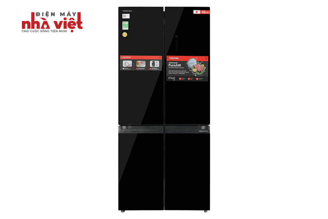- Toshiba GR-RF677WI-PGV(22)-XK thuộc dòng tủ lạnh Multi Door có 4 cánh, thiết kế cửa kính đen cường lực sang trọng, tạo điểm nhấn cho không gian bếp gia đình thêm đẳng cấp, thời thượng.
