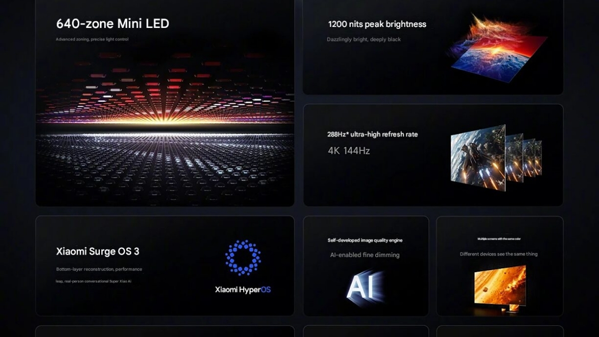 Điểm ấn tượng trên chiếc TV này là tấm nền Mini LED cao cấp với 640 vùng làm mờ độc lập, giúp tăng cường độ tương phản và hiển thị màu đen sâu hơn. Màn hình có độ phân giải 4K, tần số quét gốc 144Hz và có thể tăng lên mức tối đa 288Hz cho các cảnh chuyển động siêu mượt.