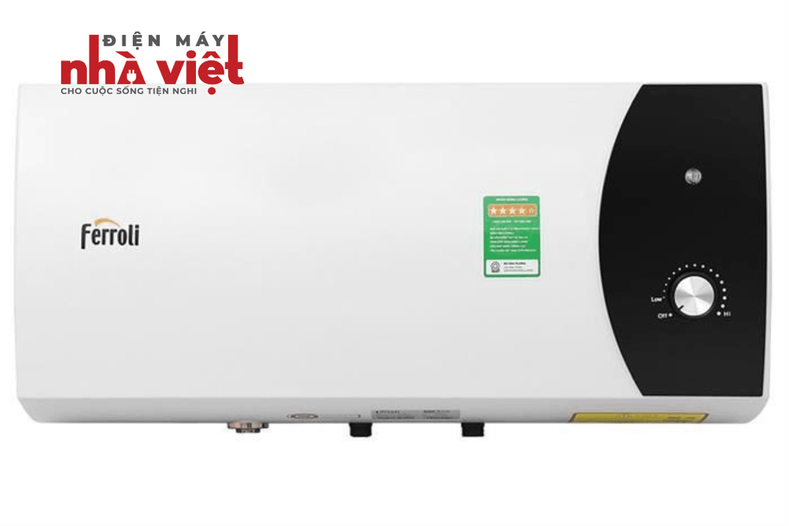 - Máy nước nóng gián tiếp Ferroli có thiết kế hình chữ nhật ngang, nhỏ gọn giúp tiết kiệm diện tích, kết hợp hài hòa với nhiều không gian phòng tắm.