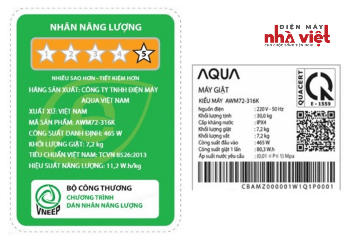 - Nhãn năng lượng 5 sao, hiệu suất sử dụng điện 11.2 Wh/kg.