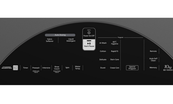Thao tác lựa chọn các chương trình, chức năng giặt trên chiếc máy giặt Hitachi Inverter 10 kg BD-100XGV cũng vô cùng nhanh chóng và dễ dàng nhờ trang bị Bảng điều khiển cảm ứng tích hợp ngay trên mặt kính.