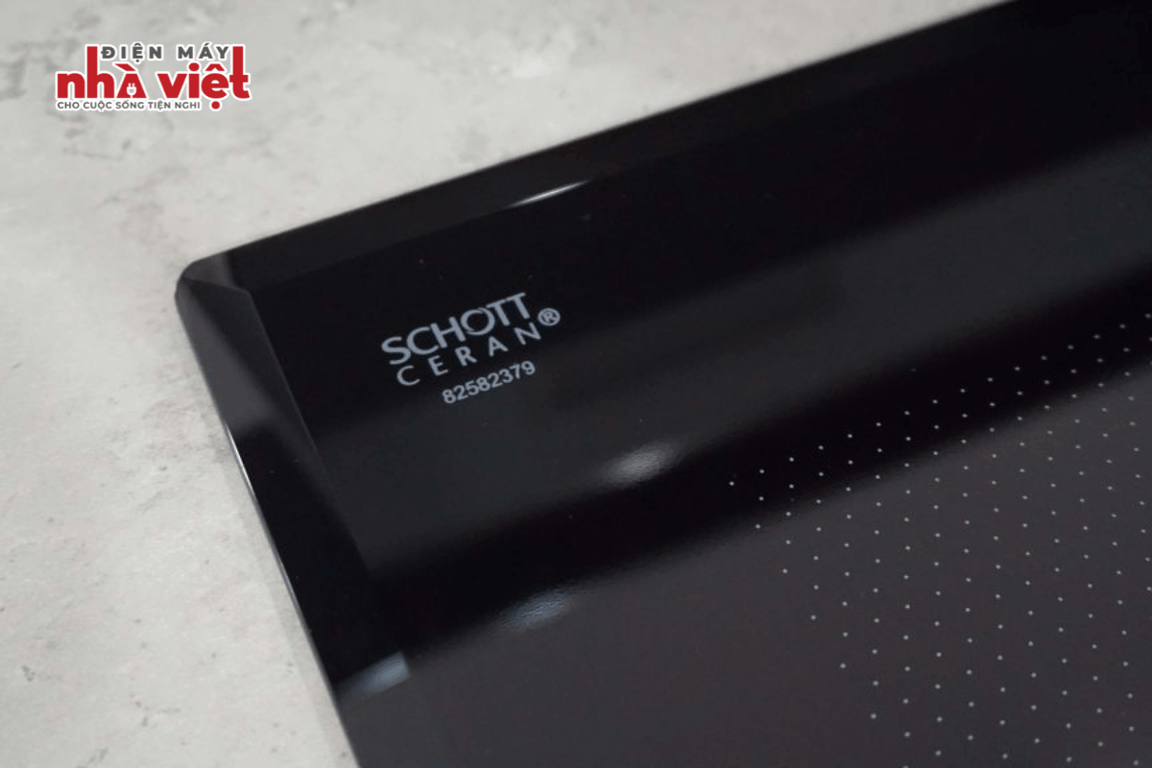 - Mặt kính Schott Ceran cao cấp đặc biệt từ Schott kết hợp với Ceramic cho khả năng chống trầy xước, chịu lực, chịu nhiệt lên đến 750oC, giúp bếp từ luôn bền đẹp theo thời gian. Đây là dòng kính của Tập đoàn công nghệ quốc tế xếp số 1 thế giới, sản xuất năm 1948 với hơn 125 năm kinh nghiệm trong lĩnh vực kính và nguyên vật liệu công nghệ tiên tiến tại Đức. Ngoài ra, mặt kính được vát 4 cạnh tinh tế không chỉ mang tính thẩm mỹ cao mà còn tạo điểm nhấn cho chính không gian của gia đình bạn.