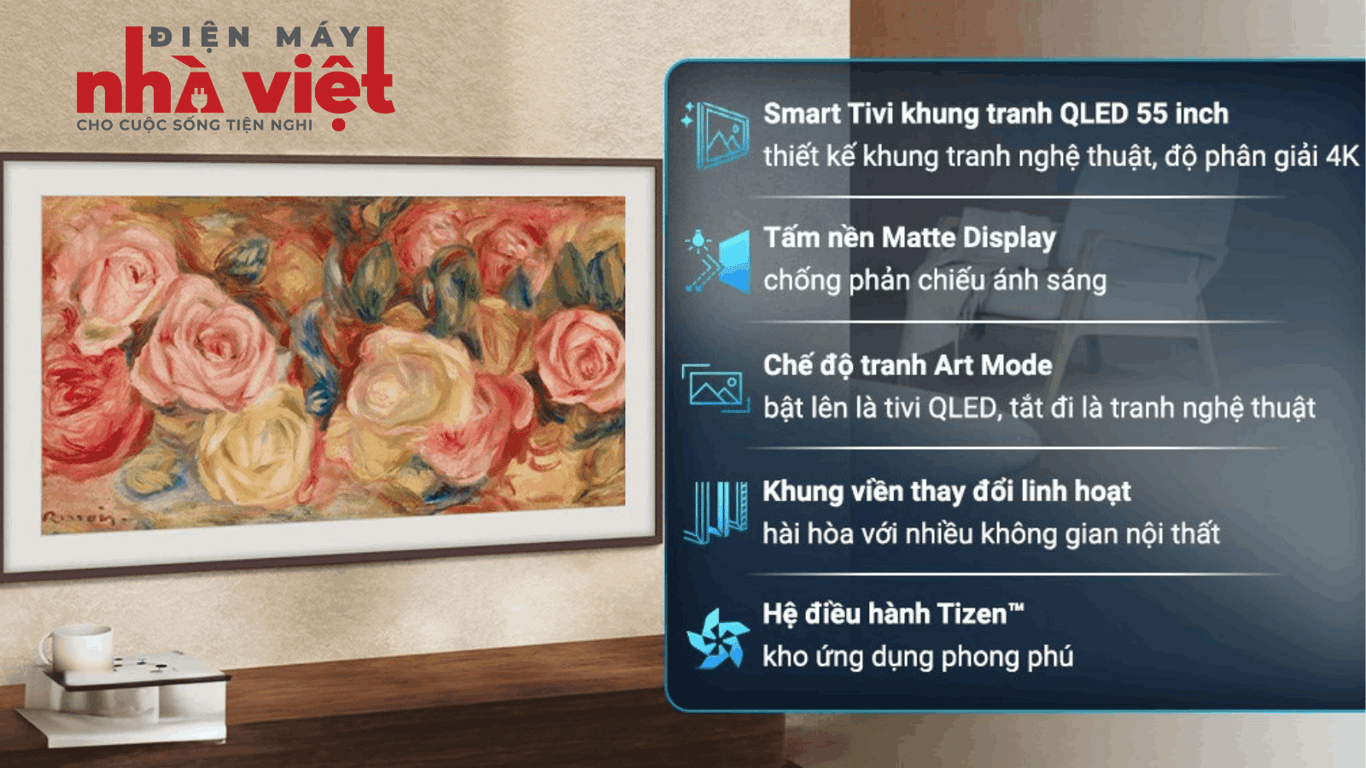 - Công nghệ Matte Display cho trải nghiệm tranh trọn vẹn hơn với tấm nền chống phản chiếu ánh sáng và công nghệ QLED chất lượng hình ảnh 4K sắc nét.