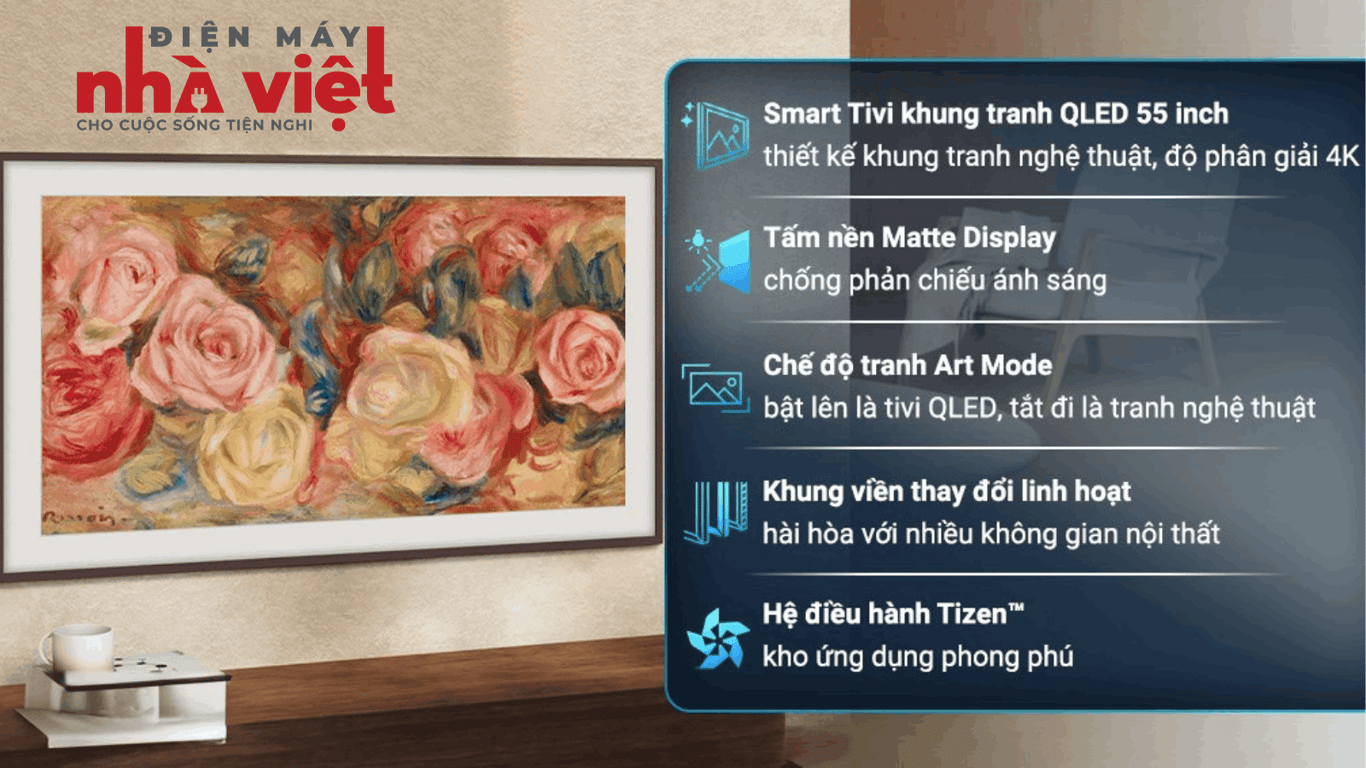 - Công nghệ Matte Display cho trải nghiệm tranh trọn vẹn hơn với tấm nền chống phản chiếu ánh sáng và công nghệ QLED chất lượng hình ảnh 4K sắc nét.