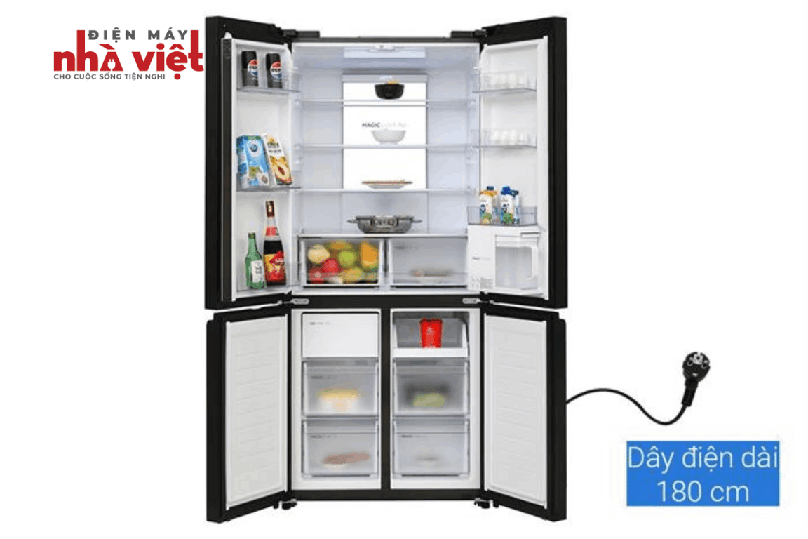 - Tủ lạnh được thiết kế theo kiểu Multi Door với 4 cửa riêng biệt, mang lại sự tiện lợi trong việc sử dụng. Bên trong, các ngăn được sắp xếp khoa học, giúp bạn dễ dàng phân loại và lưu trữ nhiều loại thực phẩm khác nhau, từ rau củ, thịt cá đến đồ uống, mà không bị lẫn mùi. Thiết kế này không chỉ tối ưu không gian bảo quản mà còn giúp bạn dễ dàng lấy thực phẩm mà không cần mở toàn bộ tủ, tiết kiệm điện năng hiệu quả.