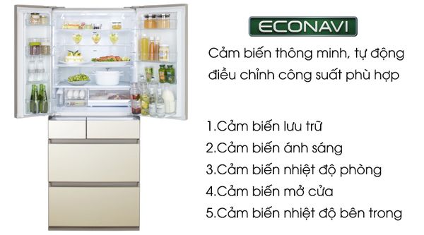 Cảm biến Econavi thông minh của tủ lạnh Panasonic có thể nhận biết mức độ ánh sáng, nhiệt độ phòng, tần suất mở đóng tủ, nhiệt độ bên trong tủ từ đó thay đổi công suất hoạt động để giảm lãng phí điện mà vẫn không gây ảnh hưởng đến chất lượng thực phẩm bảo quản.